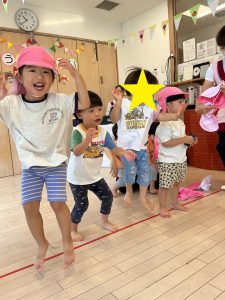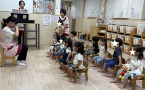 テトテやくいんです✨ 2週にわたって保育参観・給食試食会を行いました♪ ★10月18日(土)ナーサリークラス★ 普段通りに登園して・・・ パパとママたちにはカーテンの向こう側からこっそりのぞい