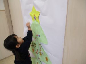 一人ひとり好きな飾りを持って、ツリーまで走って貼っていきました!