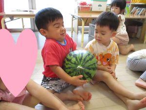テトテちはやです✨🍉 暑い日が続いていますね💦 ちはやでは、お水遊びをする前にちょっと楽しいことをしましたよ😊 すいかの絵本を観て、新聞に包んだ同じ大きさの丸の当てっこをして、、 一人一人本物のスイカを触っ