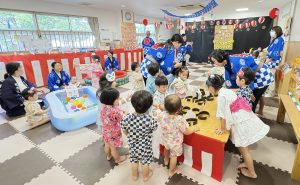 テトテちはやです✨ 夏まつりの様子をお届けします! お兄さんお姉さんがかき氷・フルーツあめのお店を担当しました🍧🍭 頼もしいですね~🥰 かき氷のシロップを上手にかけて作りました👏 ヨーヨー釣りも上手にできま