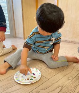 紙皿のコマを自分たちでシールやお絵描きで可愛く完成させ、クルクル回して楽しみました!