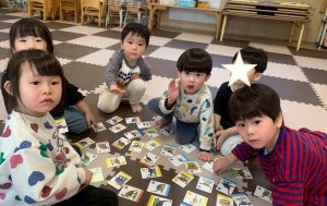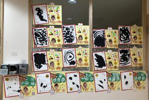 目隠しをして、まゆげ・・・目・・・と貼って行きました!完成品を見てみんな大笑い(#^^#)