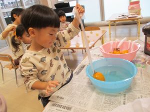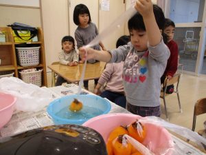 熱いお湯に気を付けながら、そうっと柿を熱湯のお風呂に入れてあげました。
