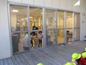 給食室からの出火を想定し、第一避難場所まで避難します。